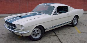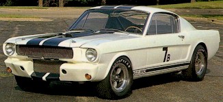 In 1965 Shelby American modified a lot of Wimbledon White fastbacks directly from the San Jose factory with the 271hp(289ci, V8) engine. The converted cars were named the GT-350 because there was 350 feet between Shelby's main assembly line and the engine room. Engine modifications boost its performance up to 306hp with a Cobra aluminum high rise intake manifold, 715cfm Holley four-barrel carburetor, Cobra cast aluminum finned valve covers and 6.5 quart oil pan, steel tubing "Try-Y" exhaust headers, low restriction mufflers, and dual side-exit exhaust pipes. Body modifications included a fiberglass hood with NASCAR-style pins and functional scoop, a cleaned up grille with a mustang logo which will become the 1969 Mustang standard, and all were Wimbledon White with blue 10 inch wide racing "LeMans" stripes. Interior modification included a high performance instrumented dash, a collection of different wooden steering wheels, removing the back seats and placing the spare tire there to classify it as a SCCA racing series sports car, and many others. Shelby VIN plates were affixed directly over the Ford VIN numbers. 562 units where built in 1965 which included 521 street versions($4547),