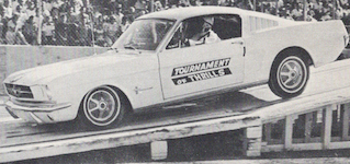 The 1965 Tournament of Thrills Mustangs were special ordered for the Philadelphia based stunt show which featured at least 4 1965 white hardtops, 1 white fastback and one darker fastback. Another special order of Mustangs were used by the show in 1968 featuring the 1969 Mustang. The stunt show featured ramps, precision driving, crashes, and two-wheel driving. In 1965, many of the shows were featured on the CBS TV Sports Spectacular.