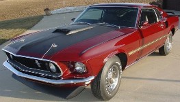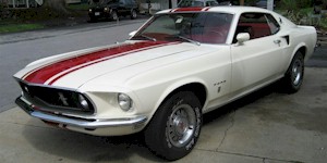 The 1969 Mustang reached the top of its performance years with the largest selection of engines and sport/speed packages to date. 10 engines were offered, 8 of them were V8s. Several levels of sport/performance packages were offered. The GT option ($147 base upgrade) was offered on all body styles which started with the 351ci Winsor V8, special handling options, racing stripes, dual exhaust, hood pin type latches, and styled wheels with Argent Silver trim and GT hubcaps. The most popular sport/performance upgrade was the 1969 introduced Mach 1 (starting at $733 over the base V8 fastback or "SportsRoof" body) which came with one of four high performance V8 engines, optional NASCAR-style hood lock pins, chrome styled steel wheels, chrome exhaust tips, color-keyed racing mirrors, and special handling. Two Cobra packages were offered: the Cobra jet with the 335hp (428ci V8) while the Ram Air induction 360hp (428ci V8) was offered on the Super Cobra Jet. The highest performance engine 370hp(429ci V8 semi-hemi big block) came on the 1969 introduced Boss which could also be ordered with a 290hp (320ci, V8, with special high volumetric efficiency "Cleveland" heads) engine. The Boss came with special "Hotchkiss" type rear suspension and many other performance options and body options to handle the larger power and seven inch Magnum 500 rims. Like the previous year, an extensive list of luxury items where available for the fastback and hardtop; but an additional luxury set under the name "Grande" was offered for the hardtop. The Grande came with a vinyl roof, plush interior, two-spoke steering wheel, full wheel covers, etc. On all body styles the indented sides scoop or cove was missing but an inverted side air scoop remained on the hardtop and convertible, while the fastback had a higher backwards C-shaped side scoop. The Mustang was longer and lower with the windshield rake increased by 2.2 degrees. The fastback roof was redesigned and was named the "SportsRoof" whose name for the fastback lasted till 1973. Inspired by the popular Shelby the front grille opening was larger, four headlights were installed, and the horse logo was mounted off center on a red, white, and blue framed vertical box.