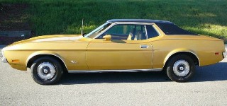 The 1972 Mustang Grande was a special luxury package for the hardtop body style. The Grande options package included a full vinyl roof with Grande script lettering, body side tape pin stripes, full wheel covers, a Lambeth cloth and vinyl luxury seats, bright pedal pad trim, deluxe instrument panel trim with wood grain, and electric clock.