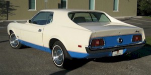 1972 Mustang body design was virtually the same as the 1971 with the same grille choices of a corralled horse with large horizontal bar or the smaller horse logo on the red, white, and blue tri-bar plague. Bumpers could be either Chrome or color-matched to the car. The Boss 351 from the previous year did not return, but the Mach 1 fastback and the Grande hardtop coupe remained. A patriotic "A" package known as the Sprint Decor option appeared midyear which started with a white body, then added light medium-blue paint to the lower perimeter and two blue hood stripes, and had red pin-striping between the white and blue. The Sprint option also had a color matched white and blue seats and carpets, white walled tires, and a 1972 Olympic flag decal on the rear fender. A "B" Sprint package had mag-type wheels. The Sprint option came mainly on the fastbacks and hardtops but a rare 50 convertibles were built for use in the Washington DC, Cherry Day parade. New color glow paint options where also available in 1972 of "Gold Glow" and "Ivy Glow" which was $34 extra.
