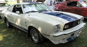 New to 1976 was the Cobra II Mustang upgrade package which could be added to any of the hatchback body styles including the Mach 1. The Cobra II package included front and rear spoilers, simulated hood scoop, quarter window louvers, and snake emblems on a white with blue stripes or black with gold stripes paint scheme. The Cobra graphics designed by Jim Wangers credited for fathering the Pontiac GTO and the entire $325 option package okayed by Carroll Shelby.