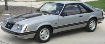 New to the 1983 Mustang GT was a rear facing non-functional hood scoop, 16 spoke alloy wheels (many chose the optional 3 or 6 spoke cast aluminum TRX wheels), and a new 4-barrel Holley 600cfm carburetor, 5.0L V8 engine delivering 175hp. Later in the year a $250 higher Turbo GT was offered with a 2.3L, electronic fuel injected Turbo 4-cycle engine. GT standard upgrade equipment included the 1983 standard new black grille, body-colored headlamp trim, aerodynamic front skirts, rear spoiler, and performance suspension and handling.
