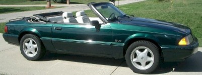 The 1990 model year followed the 1989 production year with the same three body styles (coupe, hatchback, and convertible), two main option styles (LX or GT), and two engines (2.3L 4-cycle, and 5.0L V8). A popular LX upgrade was the 5.0L engine which included a 5.0 fender badge and dual exhaust. Late in the model year, Deep Emerald Green exterior paint was offered on a convertible with the 5.0L V8, white interior, and GT wheels. Most 1990 cars (as did most late 1989 Mustangs) received a 25 anniversary tri-bar pony dash emblem. Mandatory driver side air bags and rear seat shoulder belts made its debut in 1990. This was also the last year of the Mustang ASC McLaren convertible modification which first debut in production quantities in 1987.