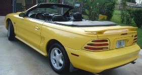 The 1994 Mustang got the first complete redesign since 1979 in this 30th Anniversary of the Mustang. The body styles were reduced from three to two by combining the fox body notchback coupe and hatchback into a sloped back coupe reminiscent of the 1960's Mustang fastback body style. Overall body styling changed by adding general curves and bringing back the side coves and front grille pony. All body trim was removed, the rear tail lights wrapped flush with the body, and continuing a tradition started in 1987, the rear bumper embossed with the Mustang letters to tell everyone that a Mustang has just sped past you. Another big change in 1994 was the replacement of the unpopular base level 4 cylinder engine with a 3.8 liter V6. The GT sports package came for both the coupe and convertible but added a 5.0 liter V8. An unusual convertible option was a removable hardtop which ended up on only about 500 of the 1994 and 1995 models. The SVT Cobra came in the same coupe and convertible but added a new front fascia with integrated fog lamps, Cobra snake emblems, a custom rear spoiler with built-in LED stop lamps, better handling, and upgrades to the V8 engine allow for 25 more horsepower. The 1994 Indianapolis used a Rio Red SVT Cobra convertible as its Pace Car allowing Ford to create a special run of pace car replicas. In 1994 Larry Shinoda, original designer of the 1969 Mustang Boss, started modifying Mustang GT's and SVT Cobras.