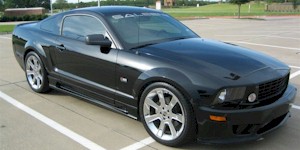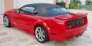The 2005 Saleen conversions were done on the new body style Mustang GTs. You could get the base S-281 model, the S-281 S/C supercharged version, and the S-281 E "Extreme" model. The first two could be ordered in the coupe or convertible body styles. The Extreme model only came in the coupe. They came standard with the Saleen Quick Ratio 5-speed manual transmission. A 5-speed automatic was optional. Suspension included MacPerson strut, 1.38 inch front and 0.79 inch rear stabilizer bars, urethane pivot bushings, and a live rear axle. Standard were big 20x9 inch wheels all the way around. Optional 10 inch wide rear wheels were available.