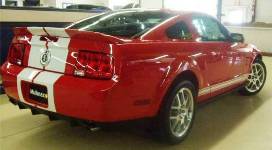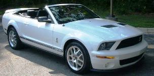Joining the Shelby GT-500 and Shelby GT in 2008 are the 40th anniversary Shelby GT-500KR (King of the Road) coupe, Shelby Super Snake GT500 upgrade, and the limited Shelby GT Barrett Jackson edition of 100 cars in black with red stripes. The GT500KR features a forward vented hood, hood pins, unique 18 inch wheels, a Ford Racing engine upgrade allowing for 540hp, and GT500KR badging throughout. The 2008 Shelby GT500 Super Snake is a Shelby factory or aftermarket parts upgrade which added many of the GT500KR features but includes GT500 Super Snake badging and 600 to 725hp of engine upgrades and tuning. The 2008 Shelby GT-500 has a 500hp (at 6000rpm), 5.4 liter, 4 valve, supercharged, V8 engine and comes in a 2-door coupe or a convertible. Seven of the Mustang 2008 colors are offered: Torch Red, Alloy dark gray, Vista Blue, Performance White, Black, Grabber Orange, and Vapor silver. Standard equipment includes: fog lamps, over-the-top racing stripes, GT500 side stripes, Shelby gas cap, unique aluminum hood with functional air vents, front fascia, unique rear spoiler, aluminum interior accent air registers, Shaker 500 Audio System, Sport leather seats, leather wrapped steering wheel, and an anti-theft system. Optional equipment includes ambient lighting, interior upgrade, Shaker 1000 Audio System, SIRIUS Satellite Radio, touch screen DVD based navigation, HID headlamps, and stripe delete options. Also in the Shelby line is the Shelby GT which starts with a Mustang GT premium modified for about $15,000 to include many of the Shelby GT500 options. The Shelby GT comes in a coupe or convertible but only in Vista Blue with silver stripes for the standard Shelby GT, coupe only in Grabber Orange with silver stripes for the Shelby GT California edition, and convertible or coupe in Black with red stripes for the Shelby GT Barrett Jackson edition.