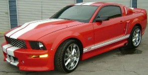 The 2008 Mustang Sherrod has two models a GT 500 S, and a V6 300 S. The GT 500S starts with the premium Mustang GT and adds a Billet type upper and lower grille, aluminum air dam/splitter, a custom rear bumper cover with aluminum air splitter bottom to match the front, side dual exhaust, rear side quarter panel air scoops, side fender heat extractors, rear duck tail spoiler, black bullitt style wheels, shaker hood with functional air scoop, and louvered C pillar window scoops. The V6 300S starts with deluxe Mustang GT and adds a lower Billet type lower grille, custom black wheels, a front lower chin spoiler, side c-stripes, a rear duck tail spoiler, side fender heat extractors, and louvered C pillar louvered panels.