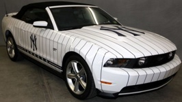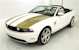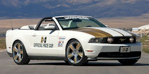 The 2010 Hurst Mustang Pace Car is a limited edition built by the Hurst's Performance Center in Irvine, California. 50 units were built. They are all Performance White GT convertibles with white interiors and white tops. Other features include; gold stripes, custom Hurst supercharger yielding 435hp and 400 ft-lb of torque, 20-inch polished forged aluminum wheels with gold-painted center spokes, BF Goodrich's g-Force KDW tires, an Eibach suspension components, Hurst-tuned coil-over dampers and upgraded anti-roll bars, gold Hurst shift handle, Hurst embroidered seats and floor mats, and Hurst team signatures on the trunk.